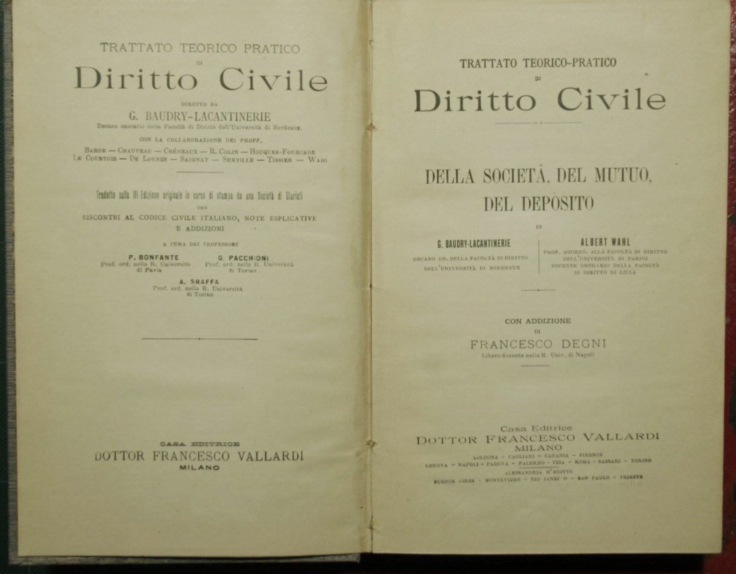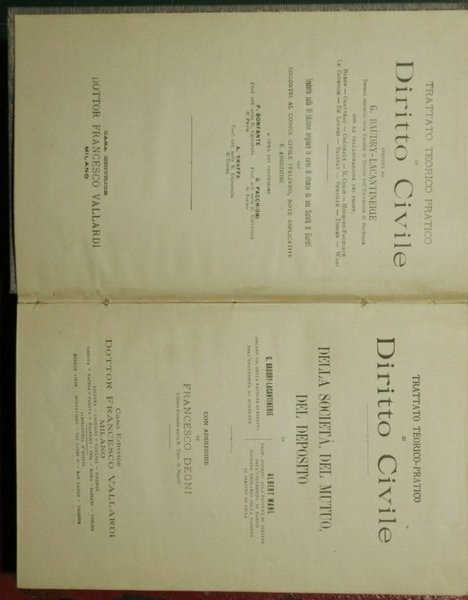 Con Addizione di Francesco Degni - Collana Trattato teorico-pratico di diritto civile diretto da G. Baudry-Lacantinerie - in 8° - pp.LXXII + 763 - Tela editoriale