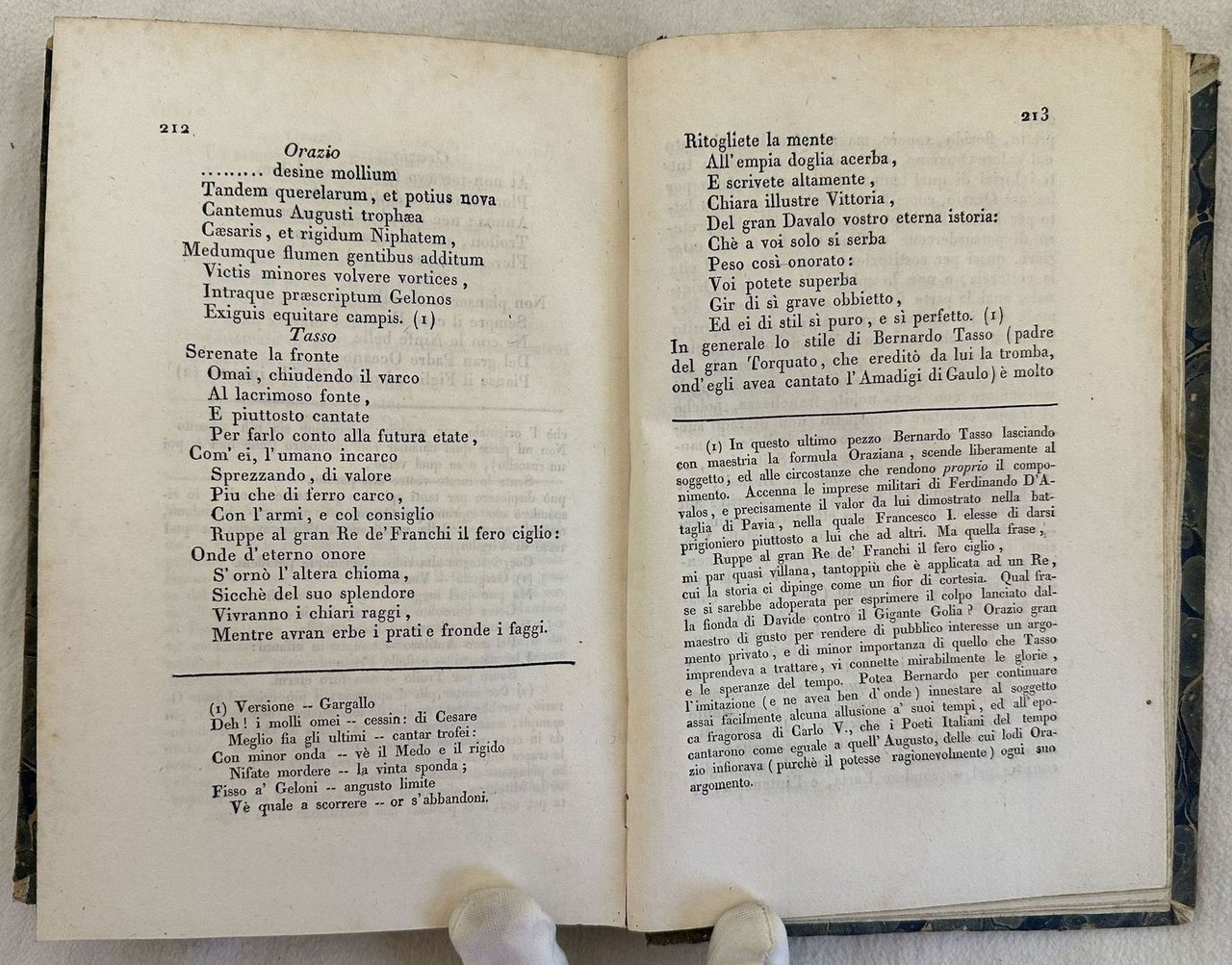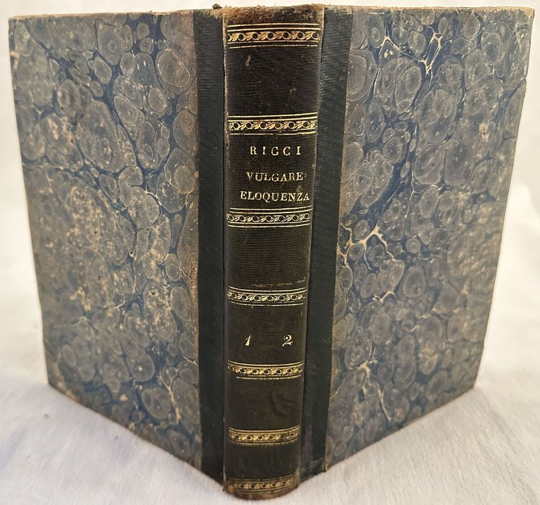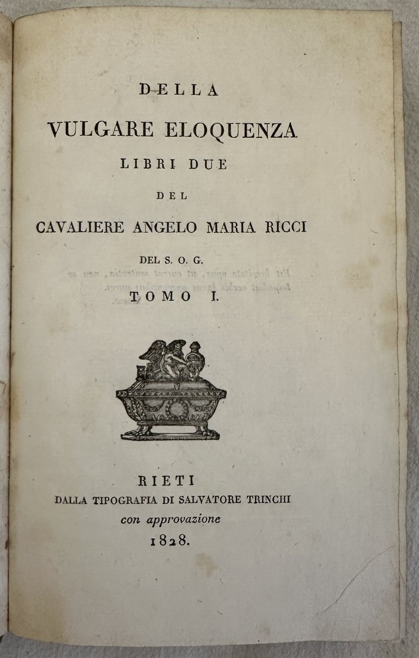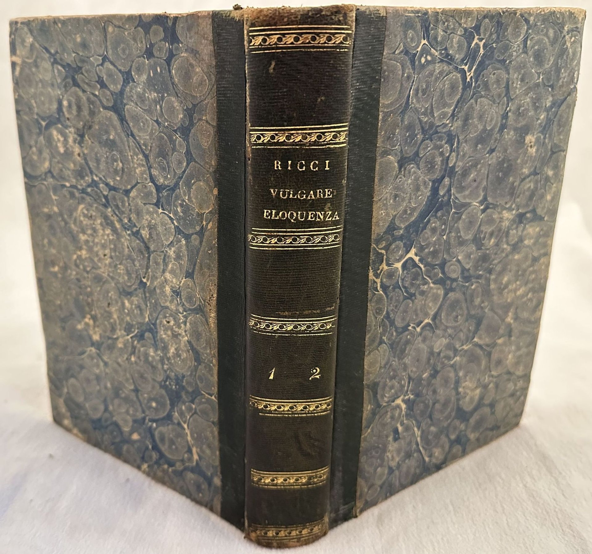 Edizione del 1828 di questa opera del poeta Angelo Maria Ricci (Mopolino 1776-Rieti 1850) uno studio sulla lingua italiana. Dedica a Don Carlo Mauri prelato domestico. L'opera è formata da due tomi legati insieme ed è completa. All'interno: Origine delle lingue volgari; Eloquenza italiana; Sublime; Del Gusto; Del Genio; Dello stile; Stile di dialoghi; Stile didascalico; Stile storico; Memorie cronache annali; iscrizioni; vite ritratti ed elegi; Stile oratorio; Stile di novelle; Della poesia; Poesia pastorale; Epigramma; Poesia lirica; Poesia didascalica; Poesia epica; Poesia drammatica; TRagedia; Commedia; Dramma musicale; Della traduzione; Della Imitazione ecc. In ottime condizioni. Copertina in mezza pelle con titolo e decorazioni in oro al dorso in buone condizioni generali con lievi usure ai margini e dorso. Legatura in buone condizioni. All'interno le pagine si presentano in buone condizioni con rare fioriture. In 8. Dim. 21x14,5 cm. Pp. XVII+(1)+276+(2). Edition of 1828 of this work by the poet Angelo Maria Ricci (Mopolino 1776-Rieti 1850), a study about italian language. Dedication to Don Carlo Mauri domestic priest. The work is made up oft wo tomes bound together and it is complete. Inside: Origine delle lingue volgari; Eloquenza italiana; Sublime; Del Gusto; Del Genio; Dello stile; Stile di dialoghi; Stile didascalico; Stile storico; Memorie cronache annali; iscrizioni; vite ritratti ed elegi; Stile oratorio; Stile di novelle; Della poesia; Poesia pastorale; Epigramma; Poesia lirica; Poesia didascalica; Poesia epica; Poesia drammatica; TRagedia; Commedia; Dramma musicale; Della traduzione; Della Imitazione ecc. In very good conditions. Half leather coeval cover with gilted title and decorations in the spine in very good general conditions lightly worn in the extremities. Binding in good conditions. Inside pages are in good conditions with occasional foxing. In 8. Dim. 21x14,5 cm. Pp. XVII+(1)+276+(2).