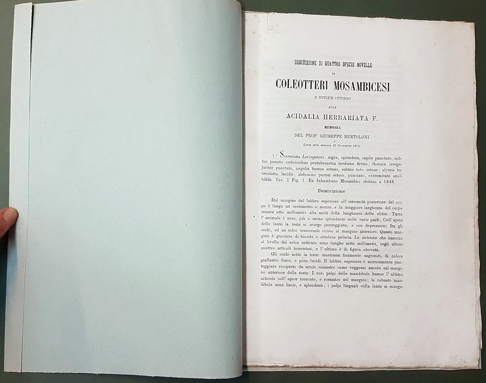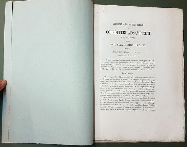 DESCRIZIONE DI QUATTRO SPECIE NOVELLE DI COLEOTTERI MOSAMBICESI E NOTIZIE INTORNO ALLA ACIDALIA HERBARIATA F. | Rare and modern books | Memoria Del Prof. Giuseppe Bertoloni
