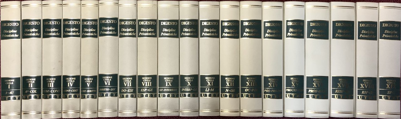Digesto. Quarta edizione. Discipline privatistiche: Sezione civile (19 volumi) e Sezione commerciale (16 volumi). Discipline penalistiche (15 volumi). Discipline pubblicistiche (15 volumi). Volume di Indici. Presidente del comitato scientifico Rodolfo Sacco