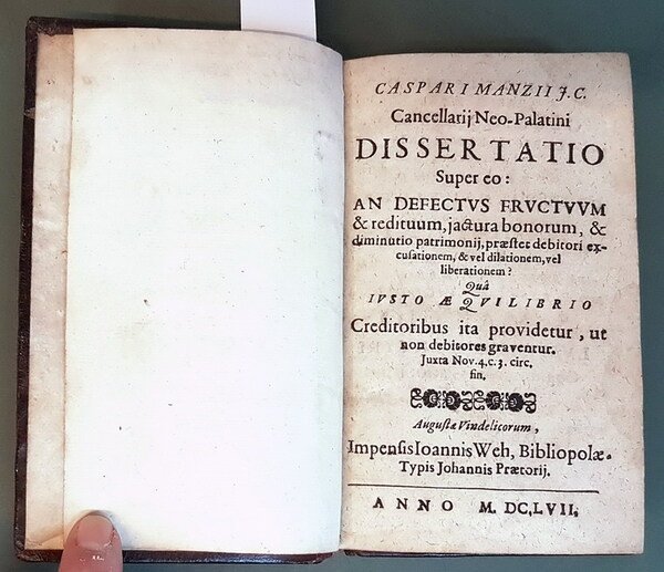 DISSERTATIO Super eo: AN DEFECTUS FRUCTUM e redituum, jactura bonorum, E diminutio patrimonij, praestet debitori excusationem, E vel dilationem, vel liberationem Qua' Iusto Aequilibrio Creditoribus ita providetur, ut non debitores graventur. | Rare and modern books | Caspari Manzii F. C. Cancellarij Neo-Palatini