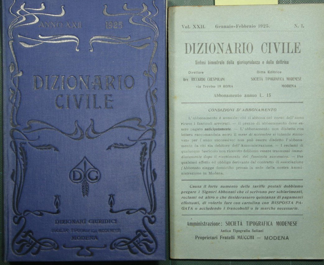 Sintesi bimestrale della giurisprudenza e della dottrina - Collana Dizionario civile - Vol. XXII, Gennaio/Dicembre 1925. Nn. 1/6 - in 8° - pp.435 (numerazione continua) - Tela editoriale - Cinque volumetti in cartella