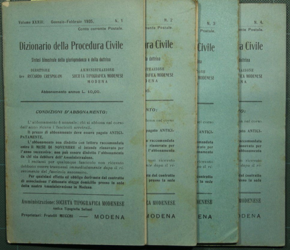 Sintesi bimestrale della dottrina e della giurisprudenza - Collana Dizionario della procedura civile - Vol. XXXIII, 1935 - Gennaio/Agosto. Nn. 1/4 - in 16° - pp.256 + 15 (numerazione continua) - Brossura editoriale - Quattro volumetti