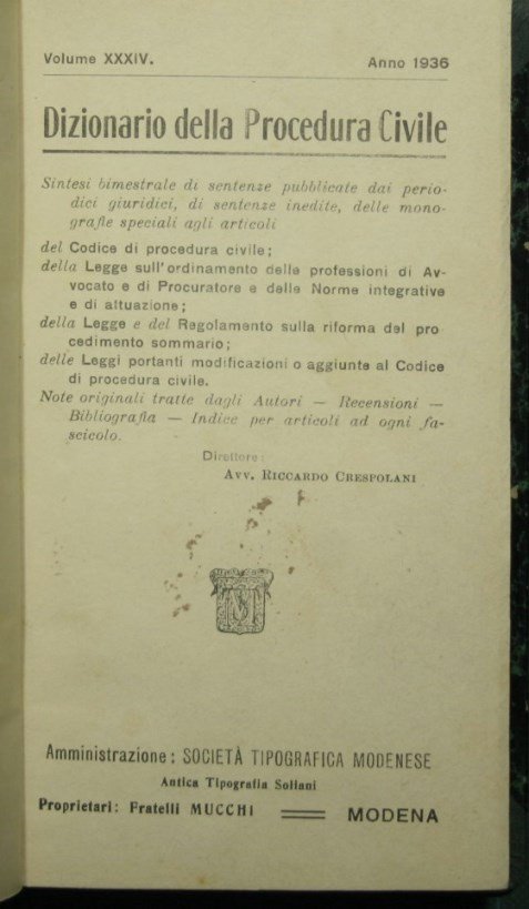 Dizionario della procedura civile - Vol. XXXIV, 1936 | Rare and modern books | Crespolani Riccardo