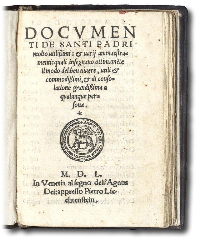 >in-16 (mm 110x77), ff. 28 n.n. (mancando B1 e C3 ma essendo inseriti due volte D2 e D3), legatura moderna ad imitazione antica in pelle con impressioni oro ai piatti. Al titolo bella impresa editoriale con raffigurazione dell'Agnus Dei e iniziale istoriata al secondo f. Prima edizione, di raccolta di scritti di Padri della Chiesa sul silenzio, astinenza, solitudine, ira, tentazioni... Curioso libretto anonimo estremamente raro (censito in sole due biblioteche pubbliche italiane: Fermo, Biblioteca Spezioli; Venezia, Correr). Buon esemplare seppur privo di due fogli. Manca a STC, Adams e Gamba.
