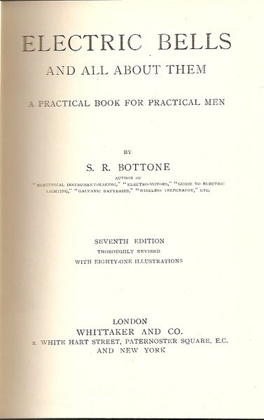 157pp + cat. VG/none 7th edition thoroughly revised with eighty-one illustrations, presumably 1908, original green cloth with black lettering on spine and board and a bell diagram on front, a remarkably clean, crisp and tight copy in excellent conditions. Practical little book on electric bells and their construction.