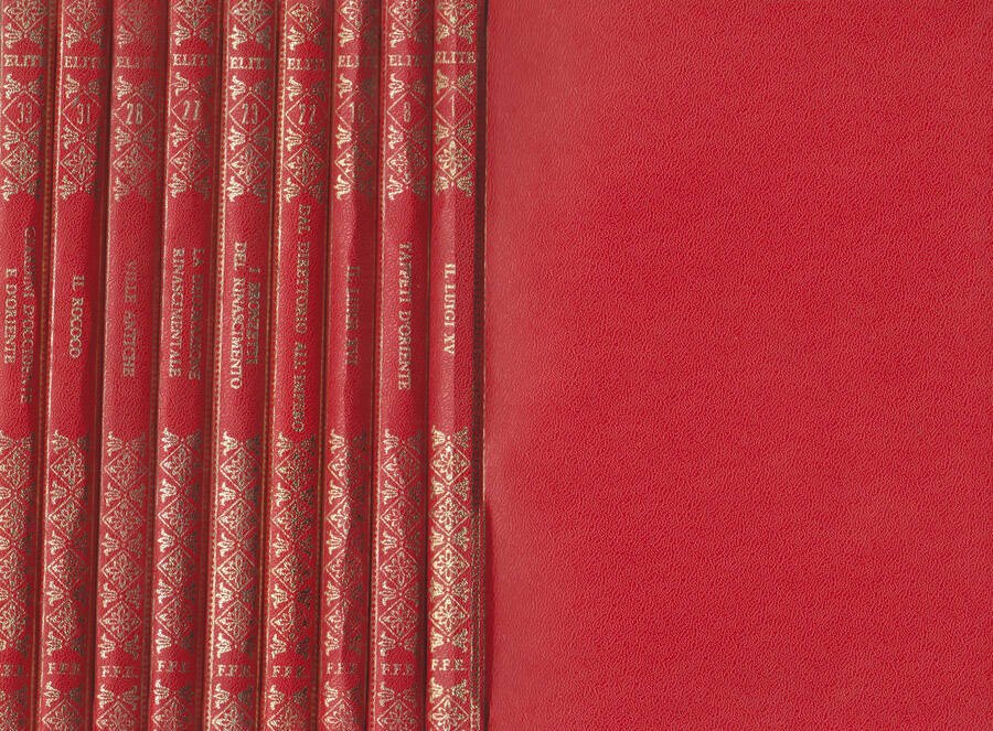 Opera incompleta. 9 volumi di 60 che completano l'opera, tutti in ottimo stato di conservazione. Rilegatura editoriale in simil pelle rossa, copertina con titoli e freggi in oro al dorso, minimi segni di usura. Tagli ben conservati, velatura di polvere al superiore. Legatura salda. Pagine conservate come non lette, lievemente ingiallite dal tempo ai margini, ricche di foto a colori, inerenti agli argomenti, nel testo e fuori testo, con didascalia. Nel dettaglio i volumi sono: I "Il Luigi XV", VIII "Tapetti d'Oriente", X "Il Luigi XVI", XXII "Dal Direttorio all'Impero", XXIII "I bronzetti del Rinascimento", XXVII "La decorazione rinascimentale", XXVVIII "Ville Antiche", XXXI "Il Rococò" e XXXIII " Giardini d'Occidente e d'Oriente". Numero di pagine 1413.