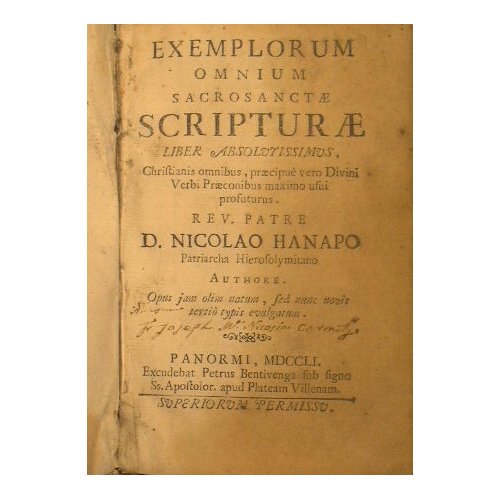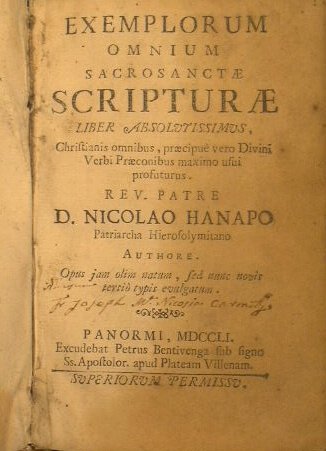 Exemplorum omnium sacrosanctae scripturae liber absolutissimus, christianis omnibus, praecipue vero divini verbi praeconibus. Rev. patre d. Nicolao Hanapo patriarcha Hierosolymitano authore