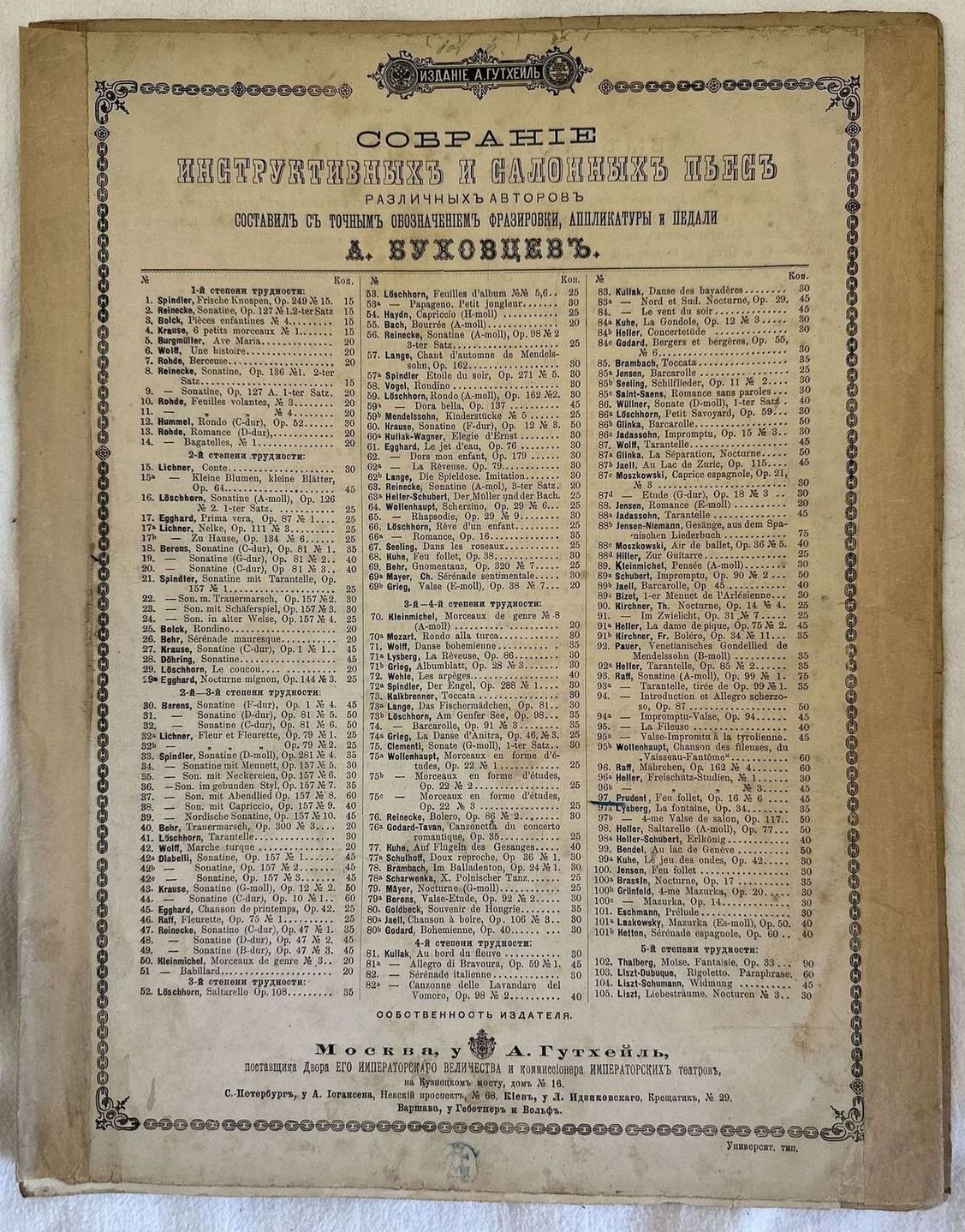 Edizione di fine ottocento della melodia "Feu follet" dall'opera 16 n. 6 del compositore francese Emile Prudent (1817-1863). In discrete condizioni. Copertina editoriale in discrete condizioni con lievi usure marginali. Rinforzo ai margini. Legatura editorialmente assente. Pagine in discrete condizioni con rare fioriture. Rinforzo al margine destro. In 4. cm.34,5x27. Pp. 11.Edition of late 19th century of the melodiy "Feu follet" from the opera 16 n. 6 by the french composer Emile Prudent (1817-1863). In fair conditions. Editorial cover in fair conditions lightly worn in the extremities. Reinforcement in the edges. Binding is editoriarly missing. Pages in fair conditions with occasional foxing. Reinforcement in the right edge. In 4. cm.34,5x27. Pp. 11.