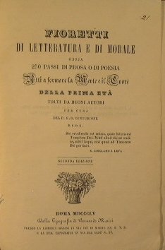 Ossia 250 passi di prosa o di poesia atti a formare la mente e il cuore della prima età tolti da buoni autori. - Per cura del P. G. B. Centurione - in 16° - pp.XIII + 175 - Mezza tela - Esemplare in buono stato di conservazione. - Mancanze al dorso e qualche abrasione ai piatti. Strappo con mancanza ma senza perdita di testo a pag. 45