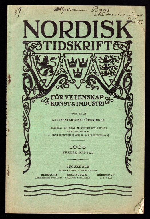 Opuscolo vintage in-8° con 24 pagg, Stoccolma, 1905. Saggi. Testo in lingua tedesca. Dedica in copertina. Illustrazione in bn all'interno del testo.