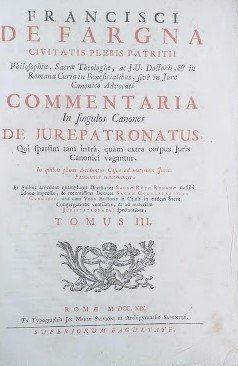 Ecco il titolo completo: "Francisci De Fargna Civitatis Plebis Patritii, Philosophiae, Sacrae Theologiae, ac. J. U. Doctoris, & in Romana Curia in Beneficialibus, sive in jure Canonico Advocati. Commentaria in singulos canones de jurepatronatus, qui sparsim tam intra, quàm extra corpus juris canonici vagantur. In quibus plures deciduntur casus ad materiam jurispatronatus concernentes. Et quibus accedunt quamplures decisiones Sacrae Rotae Romanae nullibi adhuc impressae, & recentissima decreta Sacrae Congregationis Concilii, unà cum Votis Auctoris in Causis in eadem Sacra Congregatione ventilatis, & ad materiam jurispatronatus spectantibus.