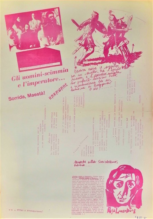 Doveva essere il soggetto per un duello tra l'operaio massa e l'operaio sociale, ho preferito lasciare tutto e rimandare la soluzione a Bologna. O no? Foglio maodada interamente stampato in inchiostro rosa, al verso "Poema nefritico in tasti unti", N. 0 in attesa di autorizzazione, piccolo strappo alla piega centrale, altrimenti ottimo.