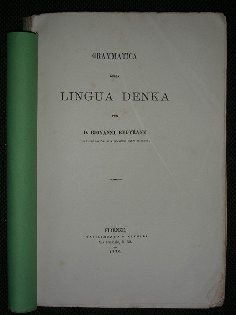 in-8 gr., pp. 159, bross. edit. Ediz. orig. Questa grammatica è il frutto degli studi dell'A. sulla tribù africana denka e dei viaggi da lui intrapresi nel 1853 su incarico del prete veronese Don Nicola Mazza. Ad accompagnare l'A. del viaggio fu il sacerdote vicentino A. Castegnaro e lo scopo era quello di progettare una missione nell'Africa centrale. Picc. mancanza al lembo superiore della copertina senza intaccare il testo. [090]