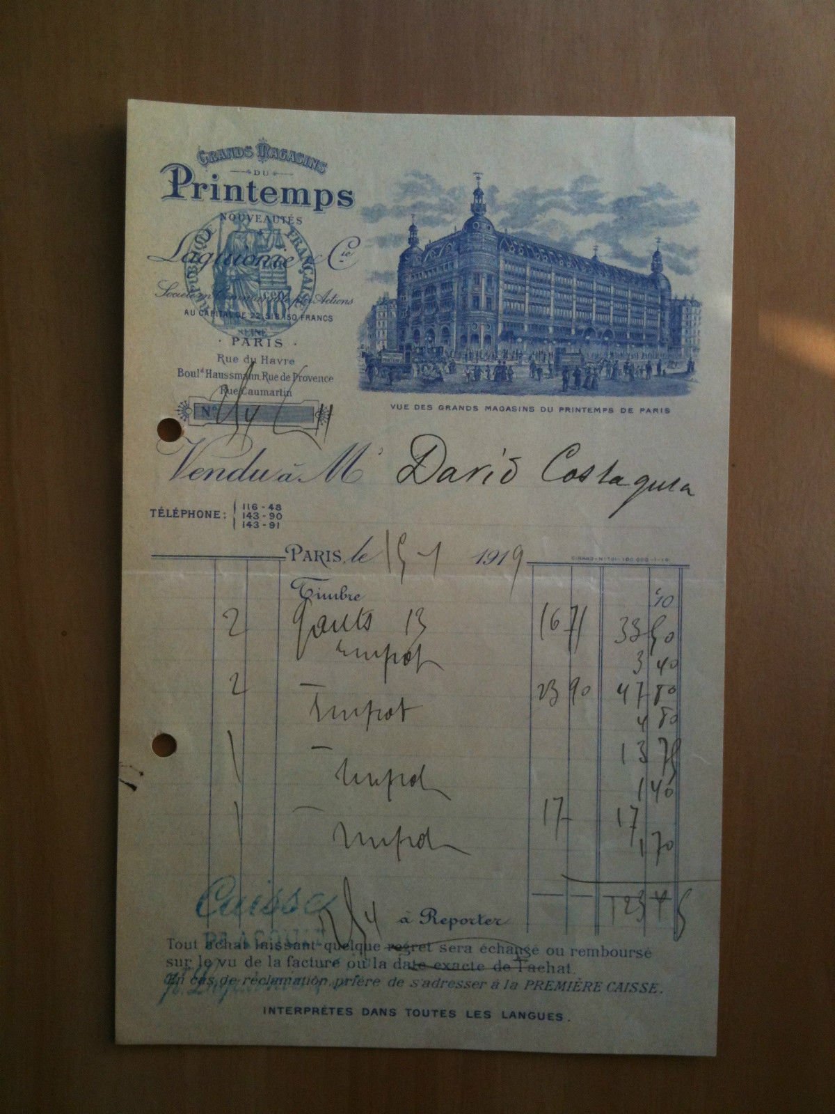 GRAND MAGASINS PRINTEMPSRicevuta/Recu francs 123,9519 gennaio 1919formato 21x13,5 cmin buone condizioni e1452