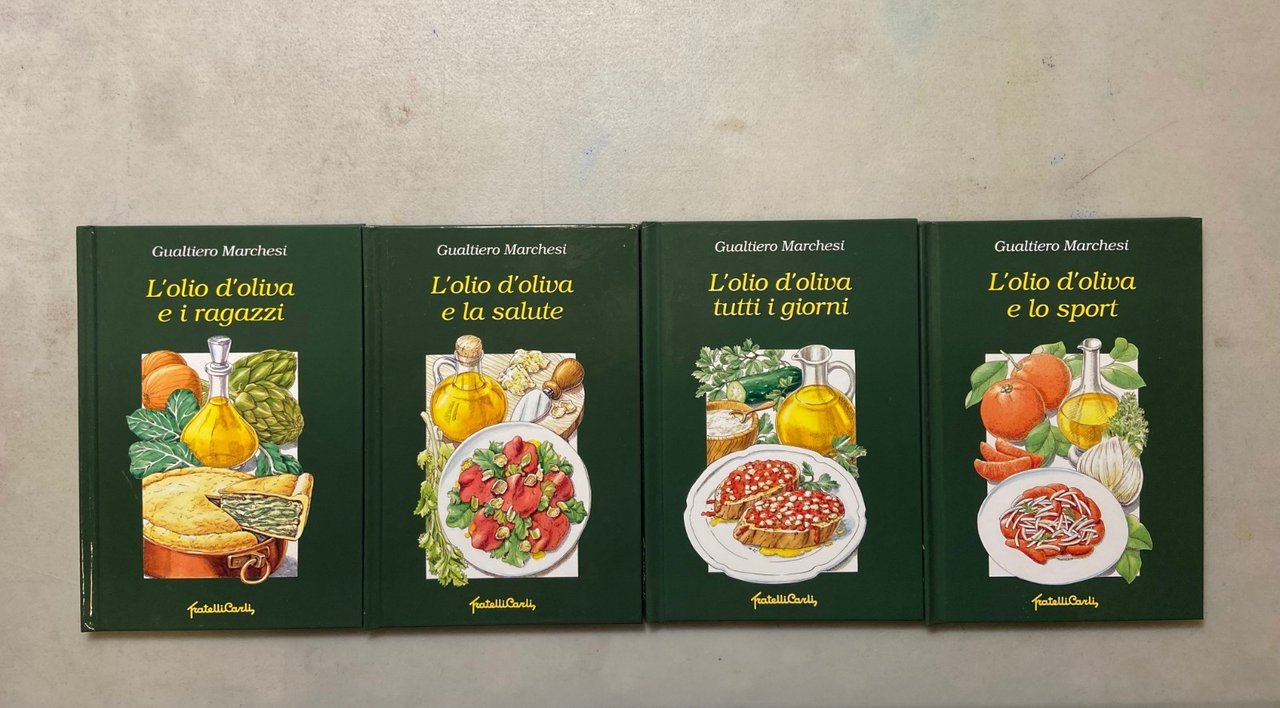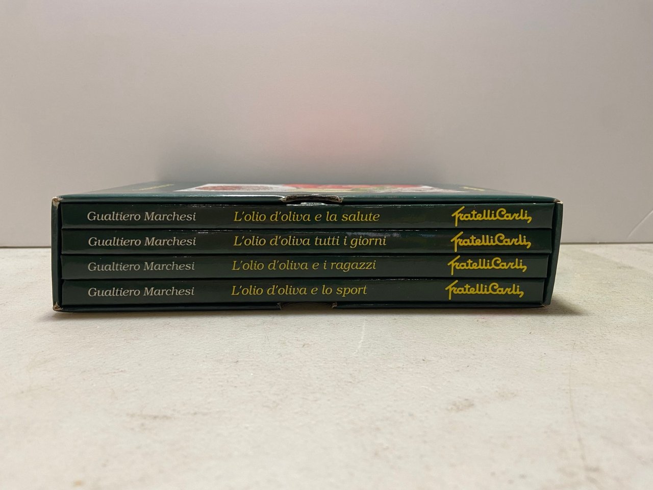 Gualtiero Marchesi L’OLIO D’OLIVA FRATELLI CARLIStampa Officine grafiche De Agostini, Novara, 1995Illustrazioni di Umberto PezzoliBrossura, 19,4x13,4Peso: 748 g.cod 2921COFANETTO CONTENENTE:- L’olio d’oliva e lo sport- L’olio d’oliva e la salite- L’olio d’oliva tutti i giorni- L’olio d’oliva e i ragazziCONDIZIONI DEL LIBRO:Come nuovo non ci sono difetti da segnalare