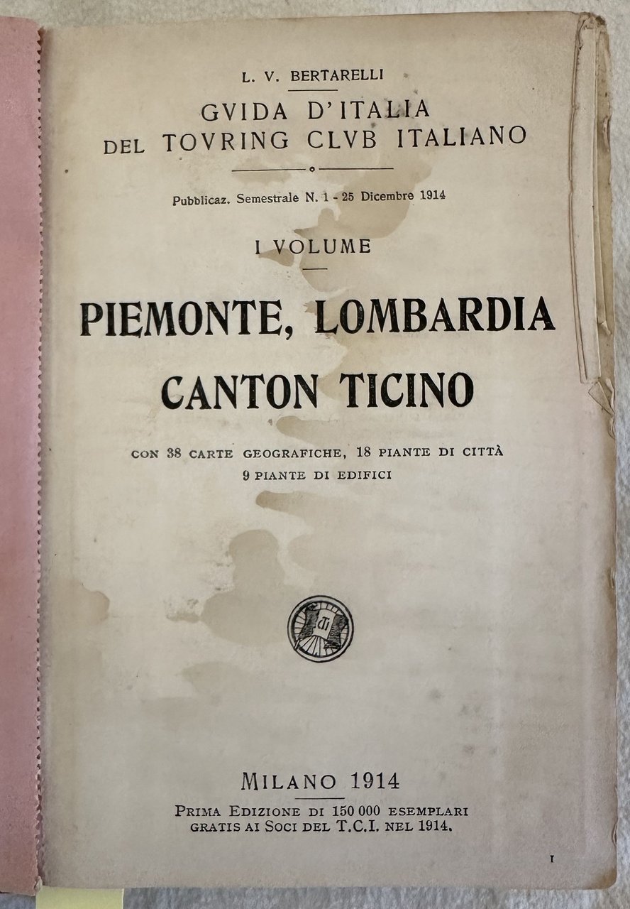 GUIDA D'ITALIA DEL TOURING CLUB ITALIANO Pubblicazione semestrale n. 1 Dicembre 1914 PRIMO VOLUME PIEMONTE, LOMBARDIA CANTON TICINO con 38 carte geografiche, 18 piante di città e 9 piante di edifici