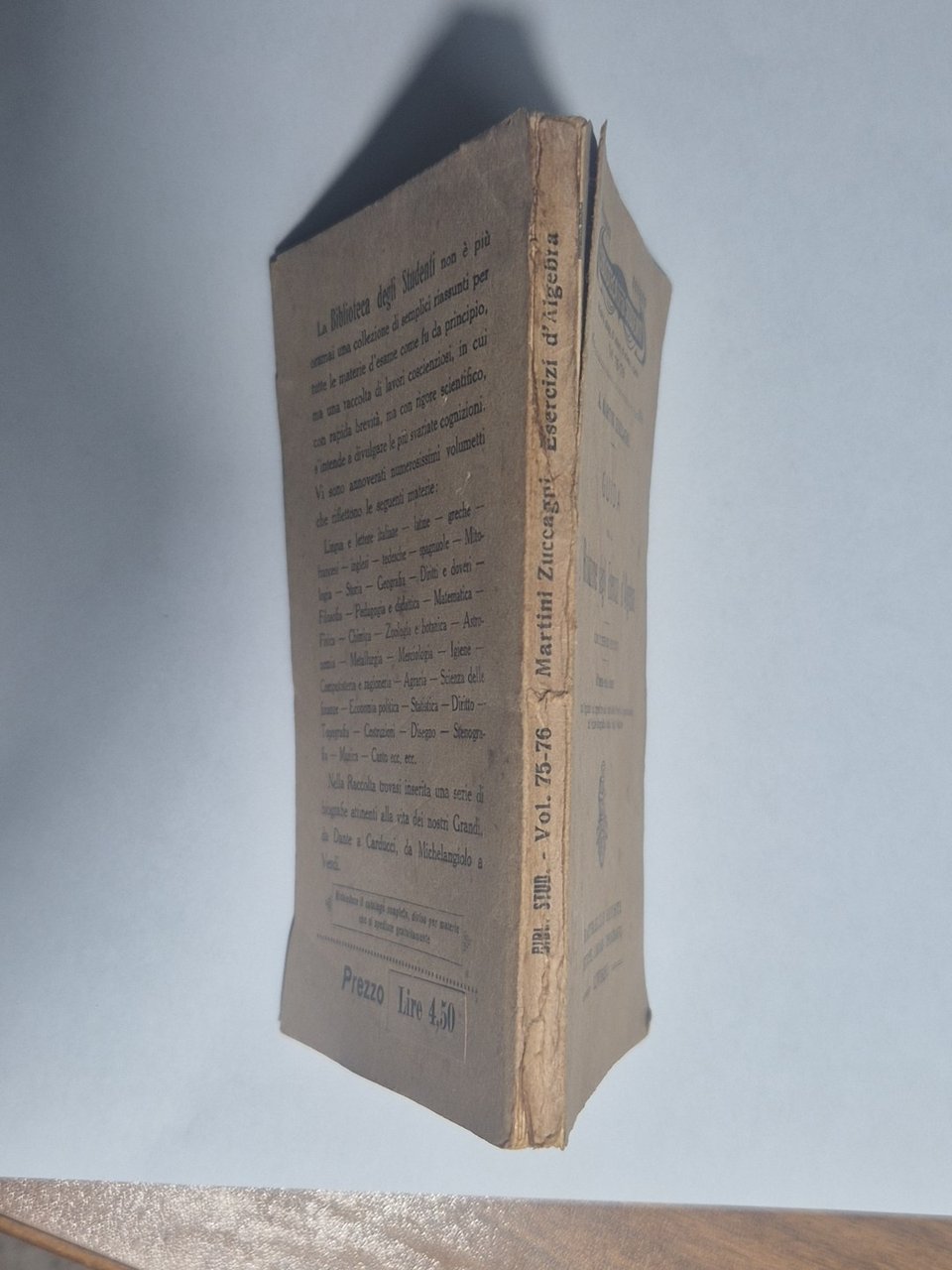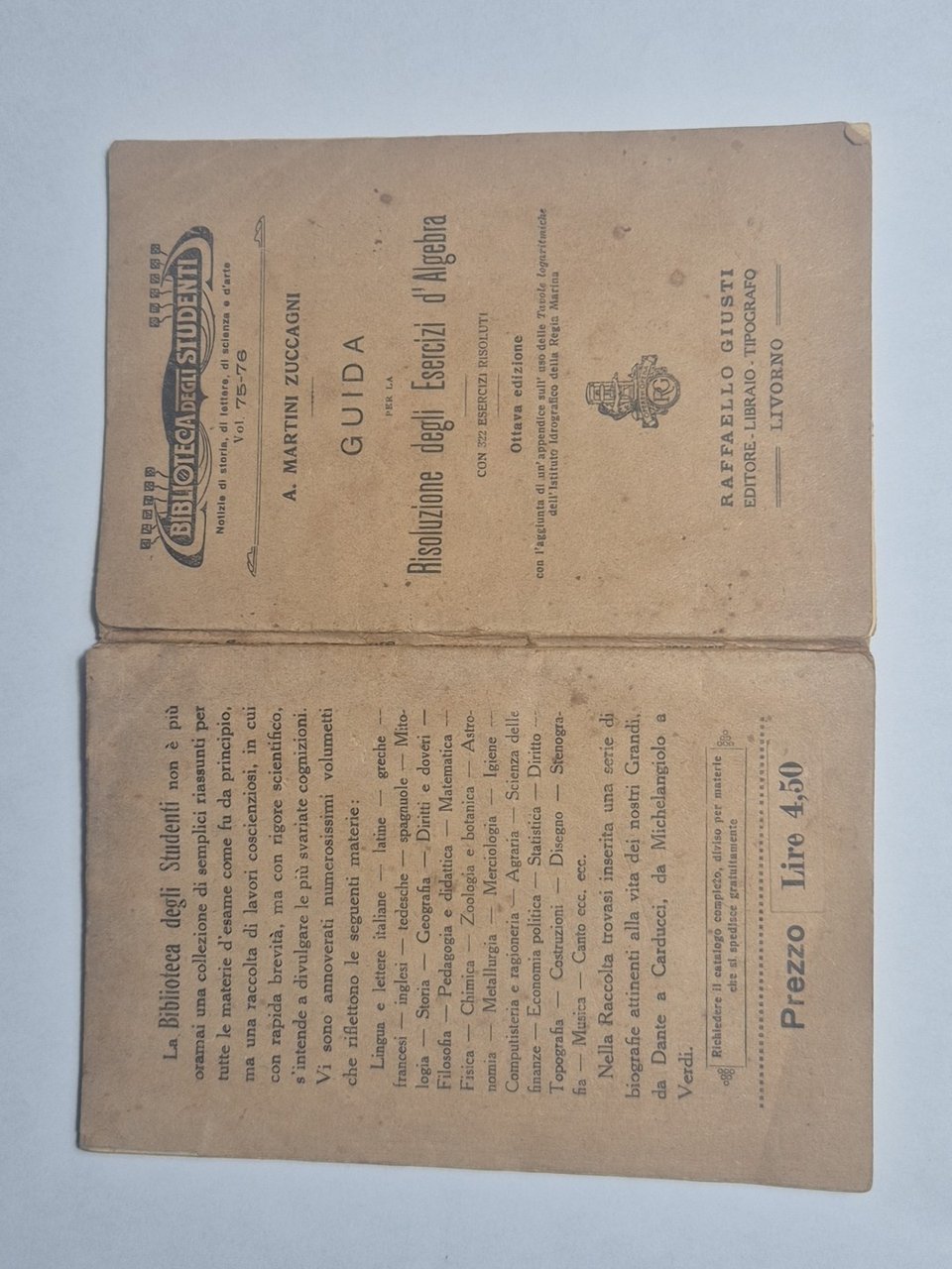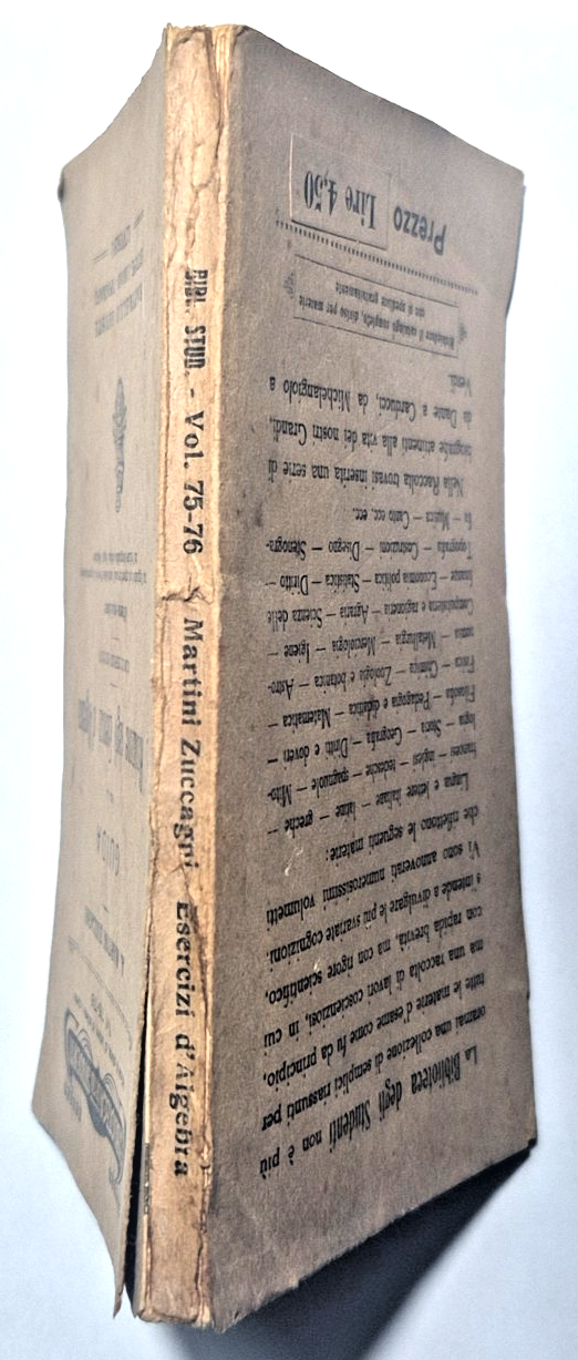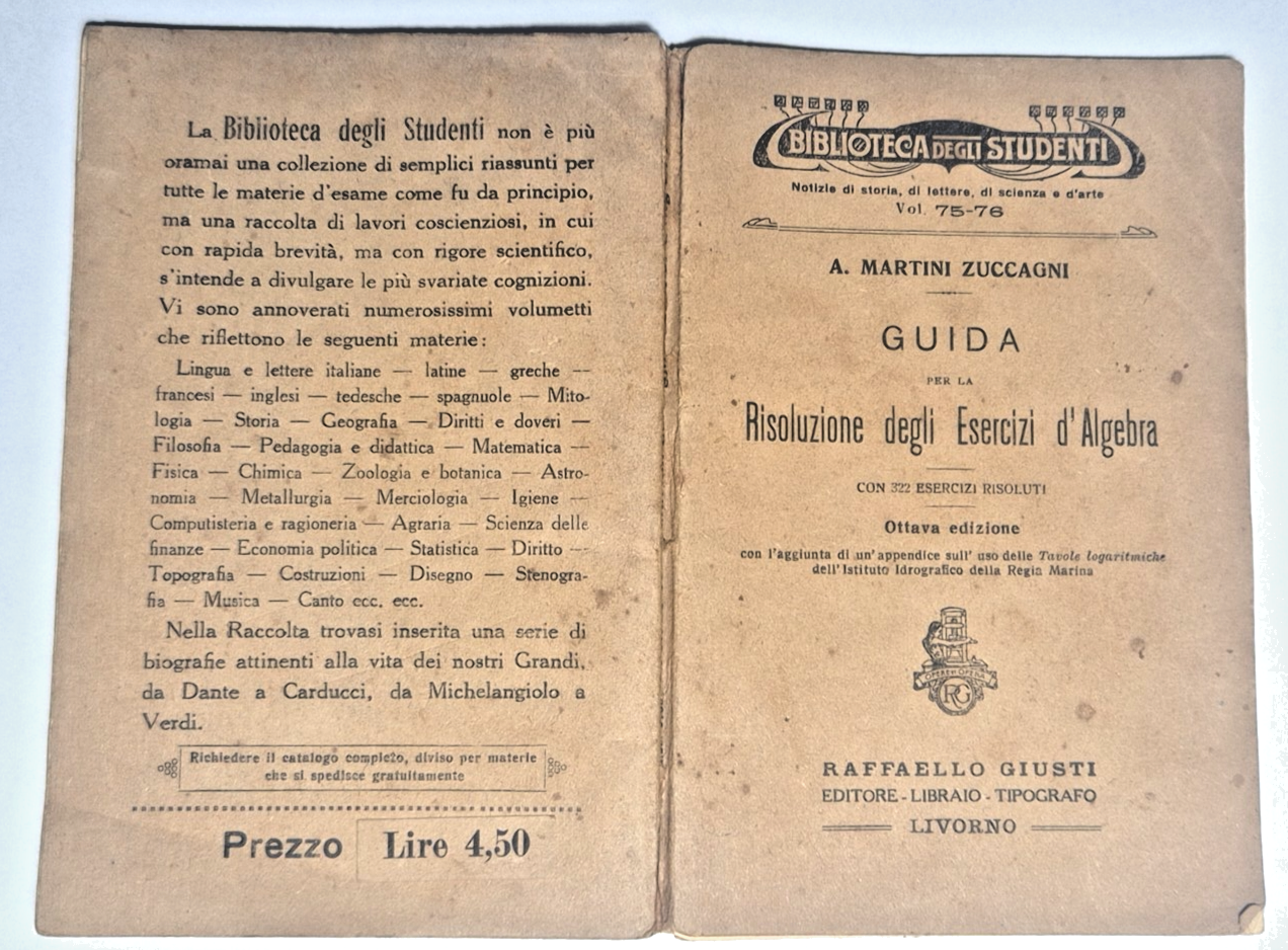 GUIDA PER LA RISOLUZIONE DEGLI ESERCIZI D'ALGEBRA con 322 esercizi risoluti di A. Martini Zuccagni. Raffaello Giusti editore, Collana Biblioteca degli Studenti, vol. 75-76. Ottava edizione 1933. VIII, 134 Pagine. Con appendice sull'uso delle Tavole logaritmiche dell'Istituto Idrografico della Regia Marina. Copertina editoriale in brossura. Stato di conservazione: molto buono (pagine ingiallite).