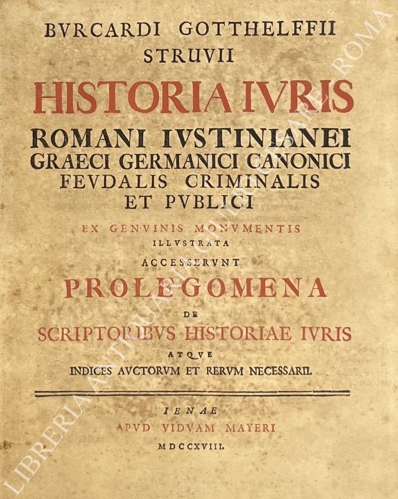 Historia iuris romani iustinianei graeci germanici canonici feudalis criminalis et publici ex genuinis monumentis illustrata accesserunt prolegomena de scriptoribus historiae iuris atque indices auctorum et rerum necessarii | Rare and modern books | Struve Burkhard Gotthelf (1671-1738) - Struvii Burcardi Gotthelf, Fii
