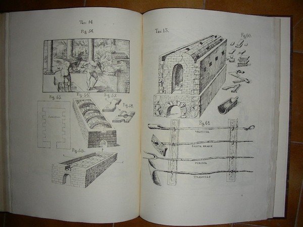 in folio, pp. 80, 39, bross. edit. Risguardi in carta dec. Tagli dorati. Con 39 tavv. litogr. al fine raff. utensili, fornaci e fasi della lavorazione e decorazione di vasi, scodelle, maioliche. Imp. trattato tecnico con indicazioni molto precise di ricette, impasti, misure per vernici e colori: invetriare, “copertare”, cuocere, dipingere, purgare la creta, dare le forme, smalti colorati, etc. L’A., di nobile famiglia bolognese trasferitasi a Perugia nel XVI sec., fu architetto esperto di ceramica e compose questa sua opera con grande corredo iconografico e grande successo, tanto che ne furono pubblicate -oltre a quelle italiane- due edizioni , una francese e una inglese. Manca a CLIO. Dif. alla carta della bross. legg. sgualcita e con un lieve alone, legg. allentato, all’interno ottimo esempl. in barbe. Ex libris. [104]