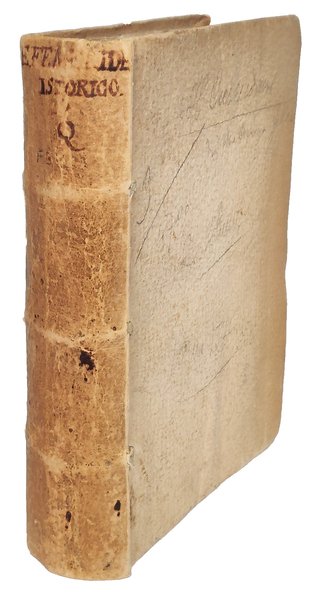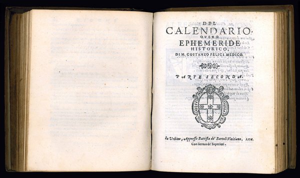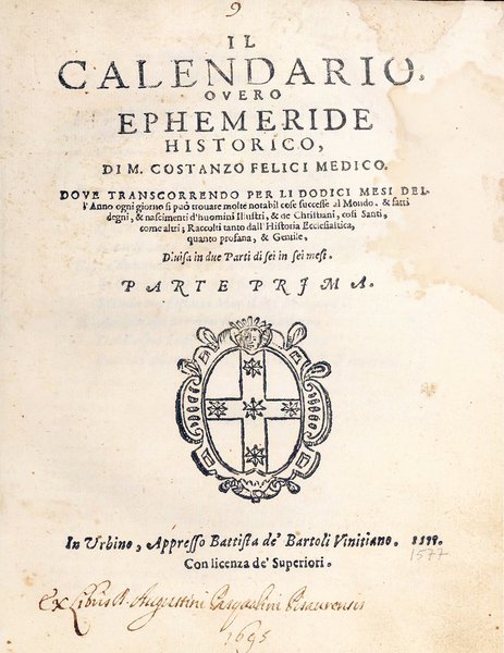 Two parts in one volume, 4to (205x158 mm). [12], 254, [2 blank]; [4], 219, [1] pp. Collation: *4 2*2 A-II4 (l. II4 is a blank); [π]2 A-DD4 EE2. Lacking at the end 4 leaves, of which the first three contain the errata corrige and the final one is a blank. Emblem of the city of Rimini on title pages and at the end of part two. Colophon at the end of part two (l. EE2r). The second part opens with its own title page at l. [π]1r: Del calendario overo ephemeride historico di m. Costanzo Felici medico. Parte seconda. On l. *2rr sonnet addressed by M. Claudio Paci da Rimini to the author. Dedication from the author to the council and consuls of Rimini. Decorative woodcut initials. Roman and italic type. Slightly later cardboards "alla rustica" with inked title on spine. Some later marginal annotations. Ownership entry on first title page: "Ex libris Augustini Pasqualini Pisaurensis 1695". Stain to the outer margin of the first 10 leaves, old repair to the upper part of the first title page affecting part of a letter, some foxing and browning, small tear to l. B1 of part two with minor loss of text, volume a bot loose, all in all a good, genuine copy.