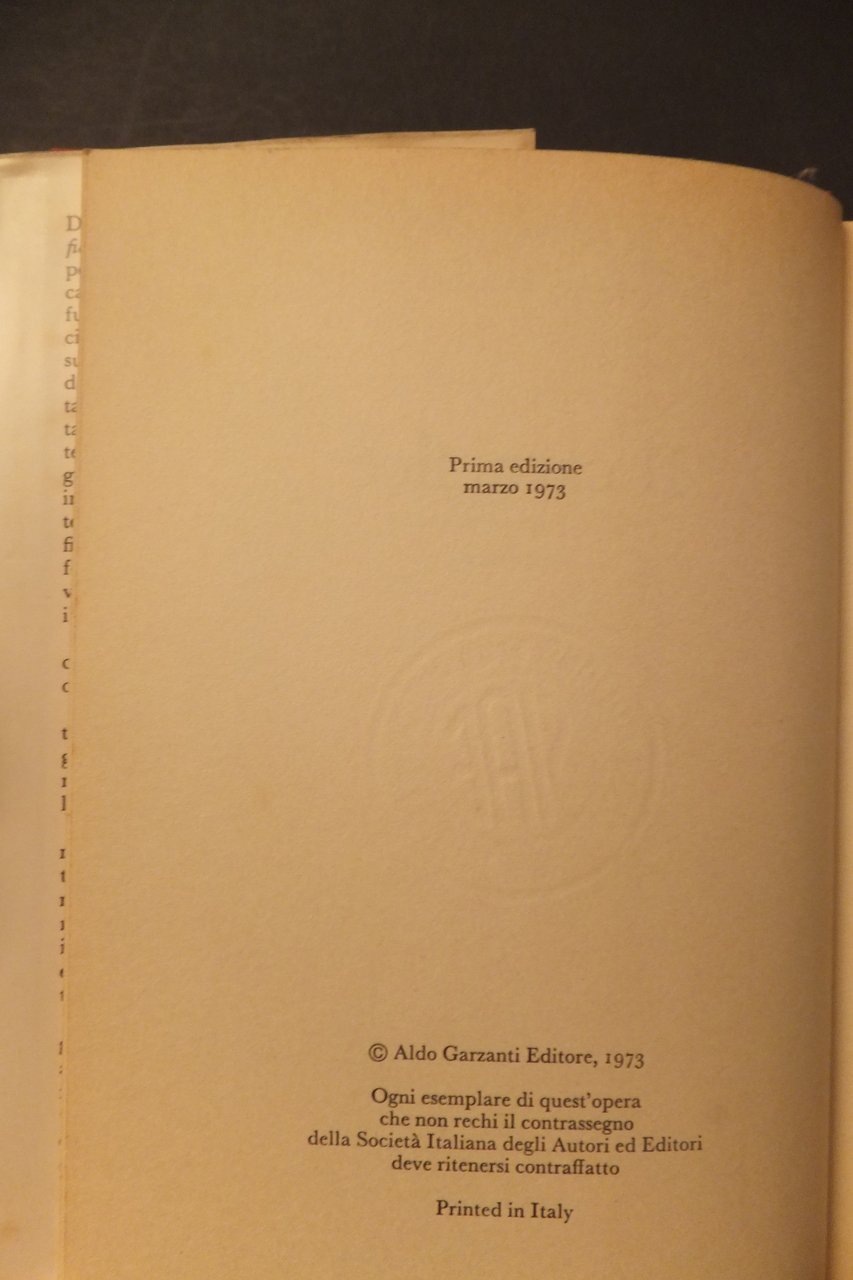 GARZANTI 1973 PRIMA EDIZIONE - COPERTINA RIGIDA SOVRACOPERTA 20 X 13 PP. 156 BUONE CONDIZIONI, QUALCHE MACCHIA ALLA SOVRACOPERTA, E AI RISGUARDI, PICCOLE MACCHIE AL TAGLIO CENTRALE.