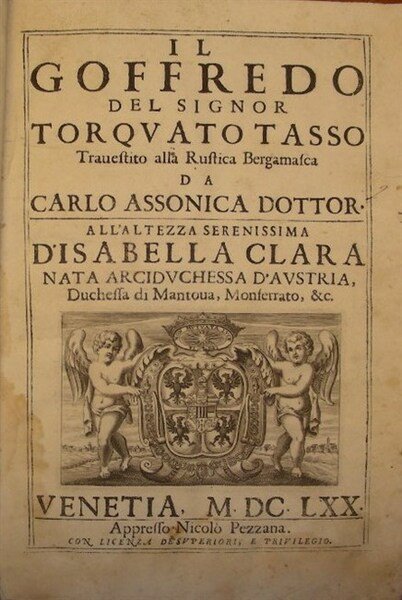 in-4, pp. (8), 400, leg. m. pelle coeva con tass. al d. Gr. incis. in rame al front. con le armi dei Gonzaga. Testo su due colonne. Prima non comune edizione della versione in vernacolo bergamasco del celebre poema tassiano, tradotto dal nobile Carlo Assonica (Bergamo 1626 - Venezia 1676) medico e letterato la cui famiglia era originaria di Azzonica. Dif. alla leg. e qualche lieve gora marginale. [055]