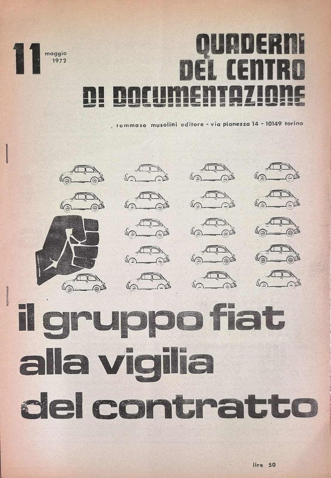Contiene "La politica della FIAT nella relazione del 1972", e prosegue con due interessanti relazioni, "Il gruppo Fiat in Italia" e "Gli stabilimenti FIAT nel mezzogiorno", che immortalano la vastità e varietà della produzione: circa 150.000 dipendenti in Italia, ripartiti fra siderurgia, automobili, veicoli industriali, trattori agricoli, accessori, aviazione, turbine a gas, materiale ferroviario; gli insediamenti al sud vengono associati alla volontà della direzione di disinnescare le lotte operaie a Torino, per cui la Fiat sceglie di installare impianti dove non esisteva alcun tessuto produttivo preesistente, precisamente a Sulmona, Cassino, Termoli, Vasto, Nardò, Termini Imerese, Lecce, Bari, Brindisi. Legatura con punti metallici, esce come supplemento a Voce Proletaria, strappi millimetrici alla prima e ultima carta, esemplare molto buono.