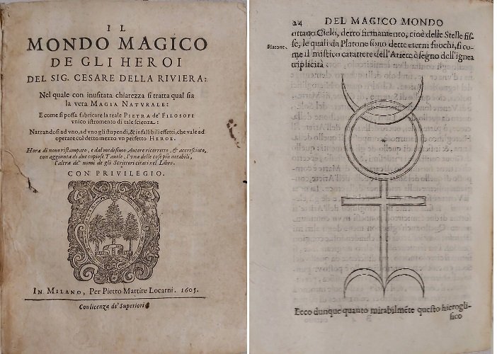 in-4 antico (mm. 210x140), pp. (30), 1 cb, 222 (manca ultima bianca), leg. m. perg. coeva con tit. oro al d. Marca tipogr. in legno. Dedicat. a Carlo Emanuele Duca di Savoia. Sonetto di Angelo Ingegneri a Cesare Della Riviera. A pag.24 incisione in legno con figura "geroglifica" del segno dell'Ariete. Seconda rara edizione, publicata 2 anni dopo la prima di Mantova del 1603, di opera esoterica e alchemica con riferimenti astrologici (influssi degli astri), tratta della magia naturale e della ricerca della pietra filosofale, si sofferma a spiegare cosa siano Geomanzia, Idromanzia e Piromanzia, con annotazioni etimologiche di alcuni vocaboli pertinenti derivanti dal latino e dal greco. Per la difficile comprensione del testo si rimanda alla riedizione curata da Julius Evola nel 1932. Magnaguti, Gli Osanna tipografi. Caillet 2951. Piantanida 2177. Casanatense 372. Cantamessa 2118bis. Duveen 166. Due picc. mancanze di carta bianca al front., e alla perg. del d. Belliss. esempl. genuino. [598]