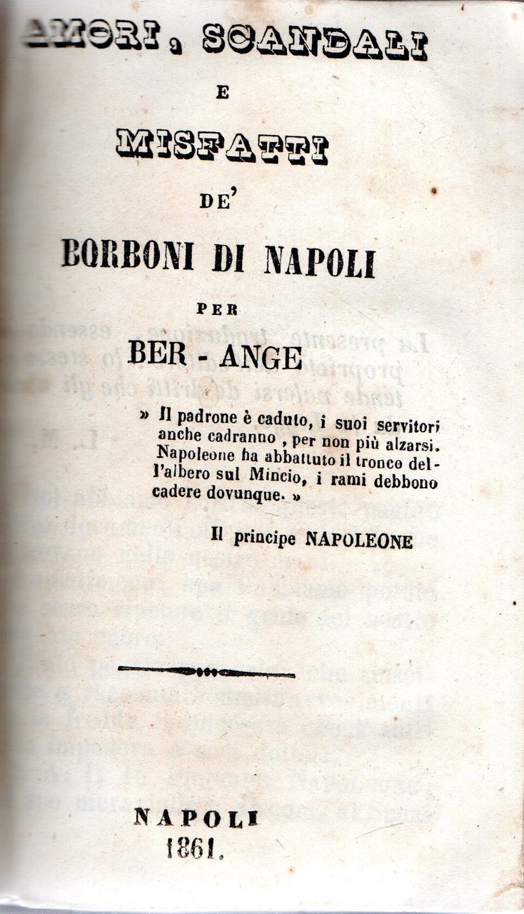 1860-1862. Mezza legatura in pelle con titoli al dorso e piatto marmorizzato. 1 vol.; 15 cm. Il volume contiene vari opuscoli: Il Movimento Italiano nel 1860 considerato de' suoi rapporti alla Religione Cattolica - Amori, Scandali e Misfatti de' Borboni di Napoli - Del Dritto del Popolo all'Insurrezione - Manoscritto scoperto nel Real Palazzo di Caserta - Le Atrocità Occulte di Bomba I. ossia Ferdinando II - Quindici Mesi di Regno Quindici Mesi di Brutalità - Ferdinando II Re di Napoli direttore di polizia - Capua e Gaeta ovvero I misteri della diplomazia - I Delitti e Le eresie dei Papi - Quello che si fa ora in Roma ovvero Le magagne papaline e borboniche - Il Nepotismo dei Papi. Lievi segni del tempo. Pagine leggermente ingiallite. Condizioni molto buone.