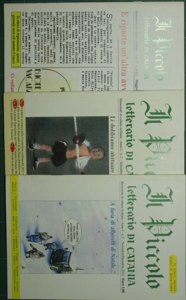 Bimestrale di cultura siciliana - Collana Il Piccolo letterario di Catania. Anno I - Nn. 0 (1)-2-3 - Maggio/Giugno-Settembre/Ottobre-Novembre/Dicembre 2012 - in 8° - pp.31; 48; 48 - Brossura editoriale illustrata - Tre fascicoli - Illustrazioni in b/n nel testo - Testo su due colonne - Prima annata completa
