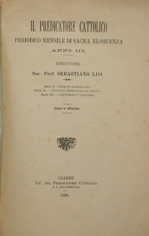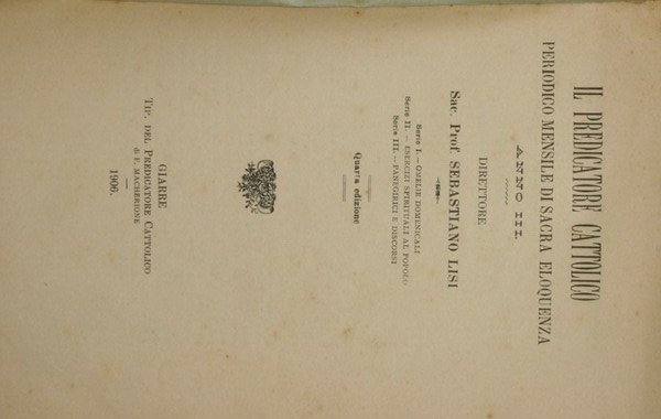 Periodico mensile di Sacra eloquenza - Direttore Sac. Prof. Sebastiano Lisi. Quarta edizione - in 8° - pp.260; 138; 164 - Brossura editoriale - Testatine e capilettere - Molti fogli ancora chiusi - Piatto superiore non corrispondente all'effettivo contenuto - Serie I - Omelie domenicali; Serie II - Esercizi spirituali al popolo; Serie III - Panegirici e discorsi