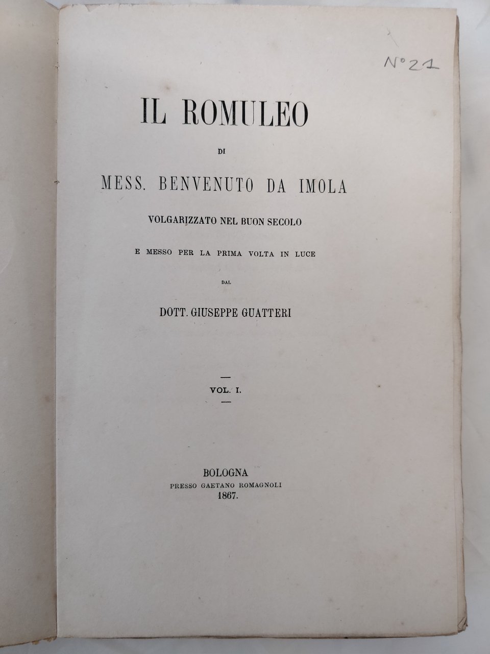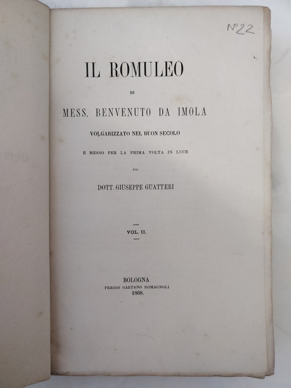 IL ROMULEO. - Volgarizzato nel buon secolo e messo per la prima volta in luce da Giuseppe Guatteri. | Rare and modern books | BENVENUTO DA IMOLA