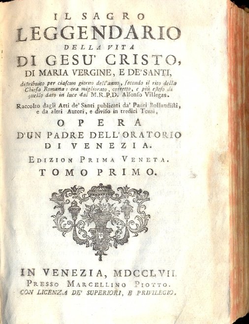 Il Sagro Leggendario della vita di Gesù Cristo, di Maria Vergine, e de' Santi, distribuito per ciascun giorno dell'anno, secondo il rito della Chiesa Romana, ora migliorato, corretto e più esteso di quello dato in luce da Alfonso Villegas. raccolto dagli Atti de' Santi publicati da' Padri Bollandisti e da altri autori e diviso in tredici tomi.