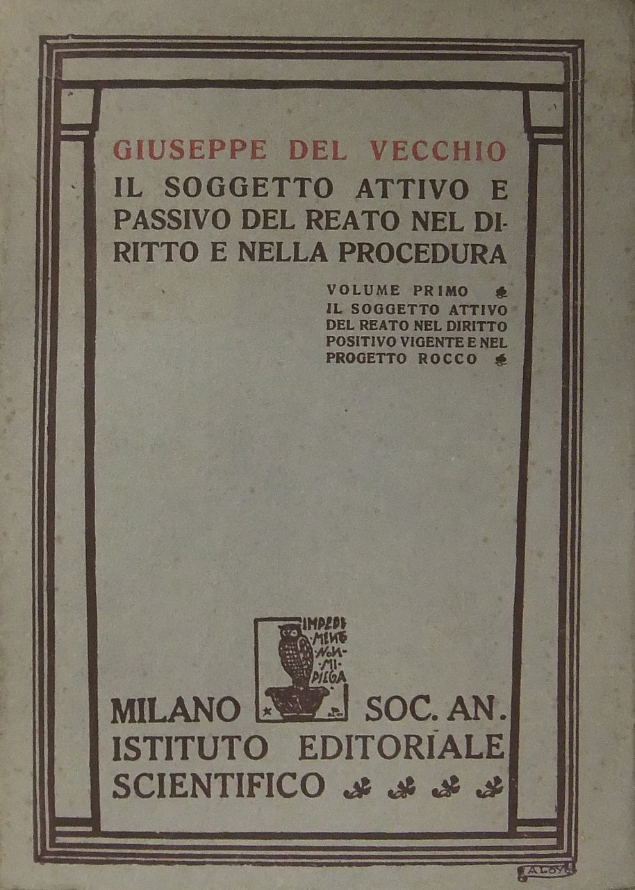 Il soggetto attivo e passivo del reato nel diritto e nella procedura. Vol. I - Il soggetto attivo del reato nel diritto positivo vigente e nel progetto Rocco (unico pubblicato) | Rare and modern books | Del Vecchio Giuseppe