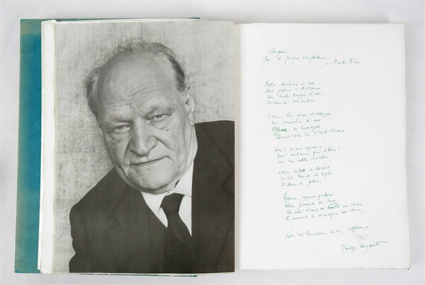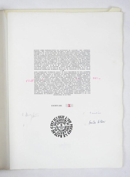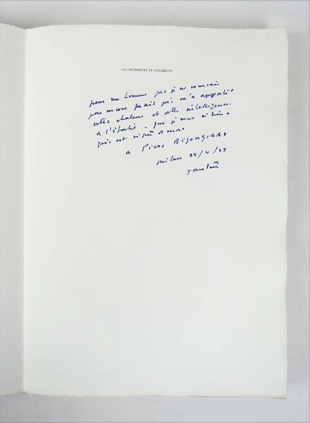LIBROPrima edizione così.CON AUTOGRAFO.Esemplare X nella serie di sole tre copie contrassegnate X, Y, Z, completo (non è prevista in questi esemplari la gouache di Fautrier). Lunga dedica autografa di Jean Fautrier al poeta e critico Piero Bigongiari. Firme autografe di Ungaretti, Fautrier e Le Noci al colophon, impronta della mano del poeta con la firma autografa. In ottime condizioni (normali segni del tempo all’astuccio; pergamino leggermente scurito al dorso).Monumentale edizione molto rara, tirata in soli 43 esemplari variamente numerati, dei quali: 15 fuori commercio numerati in lettere, contenuti in astuccio verde in carta Canson (A-D riservati ad personam agli autori; E-N e X, Y, Z); 28 commerciali numerati in numeri arabi contenuti in custodia in pergamena (solo questi ultimi comprendono una tempera originale di Jean Fautrier). -- Il volume, stampato in occasione dei 75 anni del poeta. riproduce gli autografi di: «Monologhetto», «Auguri», «Taccuino del Vecchio» e «Apocalissi».