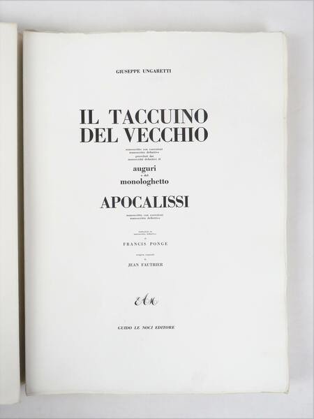 Il taccuino del vecchio. Manoscritto [.] manoscritti definitivi di Auguri e del Monologhetto. Apocalissi. Manoscritto [.] traduzioni in manoscritto definitivo di Francis Ponge tempera originale di Jean Fautrier [in copertina:] 75° Compleanno di Ungaretti