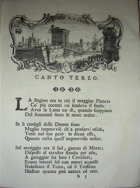 in-4, pp. (8), XXXVII, bella leg. carta dec. coeva. Dedicat. alla "Nobile Compagnia de' Veneti Patrizj che frequentano la Bottega del Caffè in S. Felice". Belliss. vignetta in rame al front. con l'allegoria di Venezia. Con 9 gr. graziose vignette (mm. 150x85) come testatine e finalini inc. in rame raff. vedute della città e animate da personaggi in costume. Poema in cinque canti in cui sono descritte le regole e lo svolgersi di una partita di tresette, con riferimenti alla città lagunare. Lensi 180. Melzi III, 173. Lapiccirella 193: "Prima edizione. Non è escluso che, almeno il gusto lo darebbe a pensare, le incisioni siano di G. B. Piazzetta". Manca a Morazzoni. Splendido esempl. su carta forte. [cat07-347]