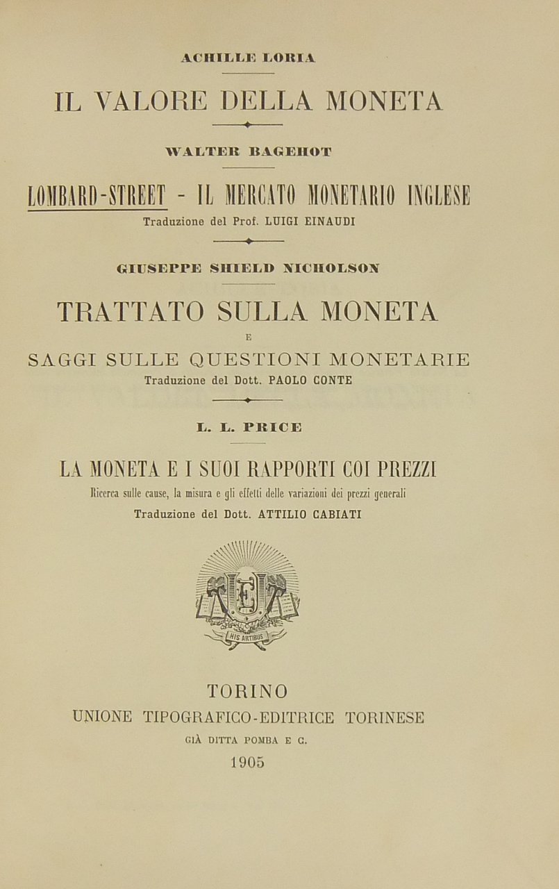 Il valore della moneta (Loria). Lombard-Street. Il mercato monetario inglese (Bagehot). Trattato sulla moneta e saggi sulle questioni monetarie (Shield Nicholson). La moneta e i suoi rapporti coi prezzi. Ricerca sulle cause la misura e gli effetti delle variazioni dei prezzi generali (Price) | Rare and modern books | Loria A. - Bagehot W. - Shield Nicholson G. - Price L.L.