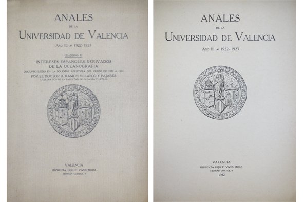 Valencia, Imprenta Hijo F. Vives Mora, 1922 [Anales de la Universidad]. 4to.mayor; 92 pp. Ejemplar con envío autógrafo de Ramón Velasco. Cubiertas originales.