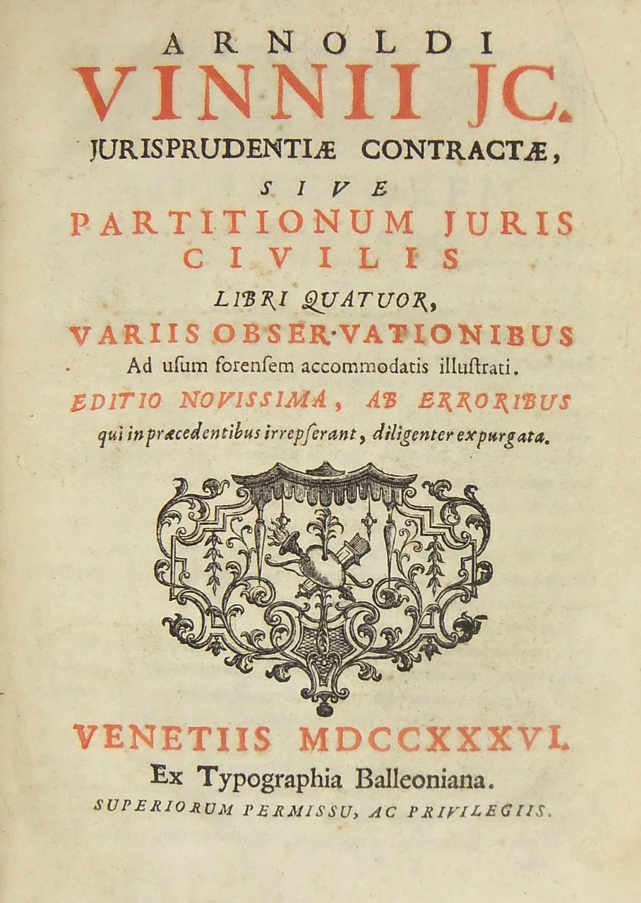 Jurisprudentiae contractae sive partitionum juris civilis libri quatuor variis observationibus ad usum forensem accomodatis illustrati. Editio novissima ab erroribus qui in praecedentibus irrepserant diligenter expurgata | Rare and modern books | Vinnen Arnold - Vinnii Arnoldi - Vinnio Arnoldo