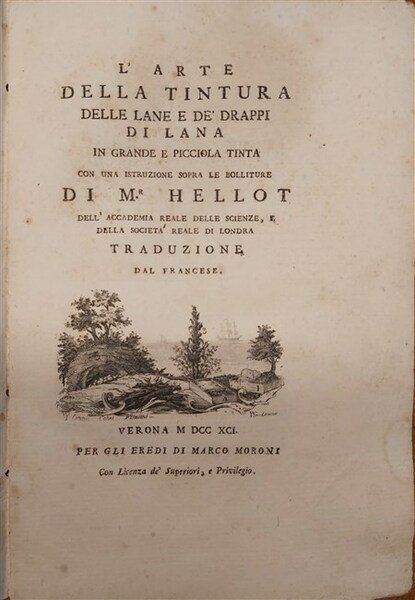 L'ARTE DELLA TINTURA DELLE LANE E DE' DRAPPI DI LANA in grande e picciola tinta. Con una istruzione sopra le bolliture di M. Hellot dell'Accademia Reale delle Scienze e della Socità Reale di Londra. Traduzione dal Francese.