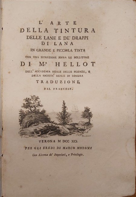 gr. vol. in-4 picc., pp. XVI, 382, leg. cart. rust. coevo. Al front. vignetta inc. da P. G. Zancon raffiguranti i cinque colori primitivi che poi l'A. spiega nella prefazione: blu, rosso, giallo, nero e falbo "ossia color di scorza o radice". Dedicat. ad Alvise Zusto. Interess. e non comune trattato sull'arte del tintore, strumenti necessari, formare i colori, metodi, miscugli di colori, della maniera di formare i feltri di lana, della cimatura, dell'oricello, dei legni, sulla bollitura delle lane, etc. Contiene inoltre, in questa prima traduzione italiana, l' "Istruzione per preparare la tinta di guado colla cenere" del Prof. Pietro Arduini dell'Università di Padova. Il traduttore è il nobile e accademico veronese Andrea Erbisti, Conte di San Dionigi, la cui famiglia possedeva una valida fabbrica di panni a Verona e il palazzo di via Leoncino sede dell'Accademia. Una brunitura al piatto ant. legg. allentato ma ottima copia in barbe su carta forte. [077]