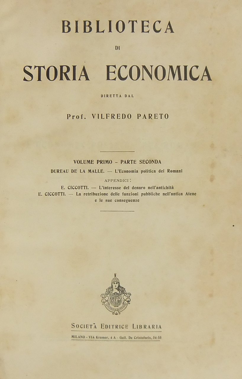 L'economia politica dei Romani (Dureau de la Malle). L'interesse del denaro nell'antichità (Ciccotti). La retribuzione delle funzioni pubbliche nell'antica Atene e le sue conseguenze (Ciccotti) | Rare and modern books | Dureau De La Malle Ciccotti E.