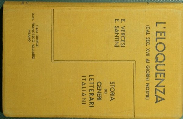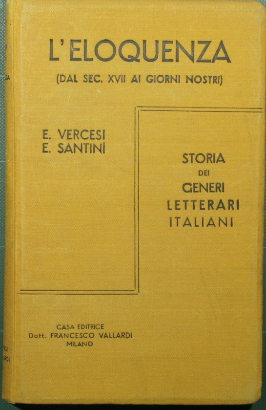 Libro I: L'eloquenza sacra in Italia a cura di Ernesto Vercesi; Libro II: L'eloquenza politica accademica e forense a cura di Emilio Santini - Collana Storia dei generi letterari italiani - in 8° - pp.VIII + 352 - Tela editoriale - Firma a matita all'occhiello