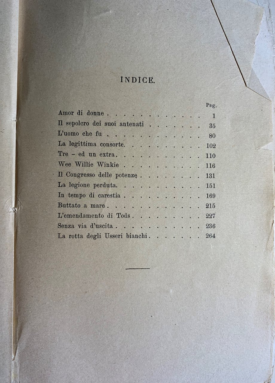 ed. Terzo migliaio della raccolta (I ed. italiana della raccolta: Milano, Treves 1925). Traduzione dall'inglese di M. Ettlinger Fano. XVI grande/ (8)+280=288/ brossura in cartoncino liscio avorio con grafica in nero e rosso. Stato buono (usura della copertina, in particolare ai margini e al dorso - copertina e pagine brunite e con qualche fioritura - parzialmente intonso).
