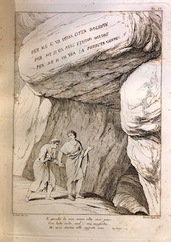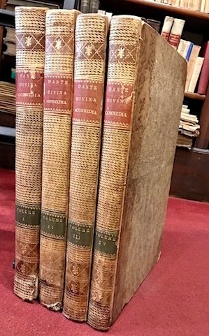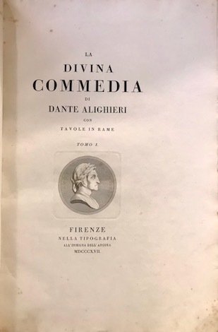 Folio (cm. 49), 4 Voll., 208, 210, 206, XI-251 pp. Con complessive 125 tavv. f.t. incise su rame e protette da velina. Frontespizi con ritratto di Dante. Raffinate legature coeve in mz. vitello biondo con ricchi decori, titoli e numerazione dei volumi su tasselli in pelle di colore diverso al ds. Segni di usura e piccoli difetti marginali ai dorsi, mancanze agli angoli, carte dei piatti sbiadite. Interni con fioriture tenui ma abbastanza diffuse per il tipo di carta utilizzato (carta velina cilindrata). Nel complesso, esemplare in più che buono stato di conservazione. Mambelli (n. 113) la definisce ‘una magnifica edizione. stampata in ristretto numero di esemplari. e arricchita da 125 tavole fuori testo: n. 44 per l’Inferno e n. 40 per il Purgatorio inventate e in gran parte intagliate da Luigi Adamolli, n. 41 per il Paradiso inventate e disegnate da Francesco Nenci, incise da Giov. Massetti, Giovanni Lapi, Innocenzo Migliavacca, Lasinio figlio e V. Benucci’. Il quarto volume dell’opera contiene la vita di Dante scritta da Leonardo Aretino e Annotazioni alle tre Cantiche tratte da Codici diversi tradotte dall’Abate Renzi.
