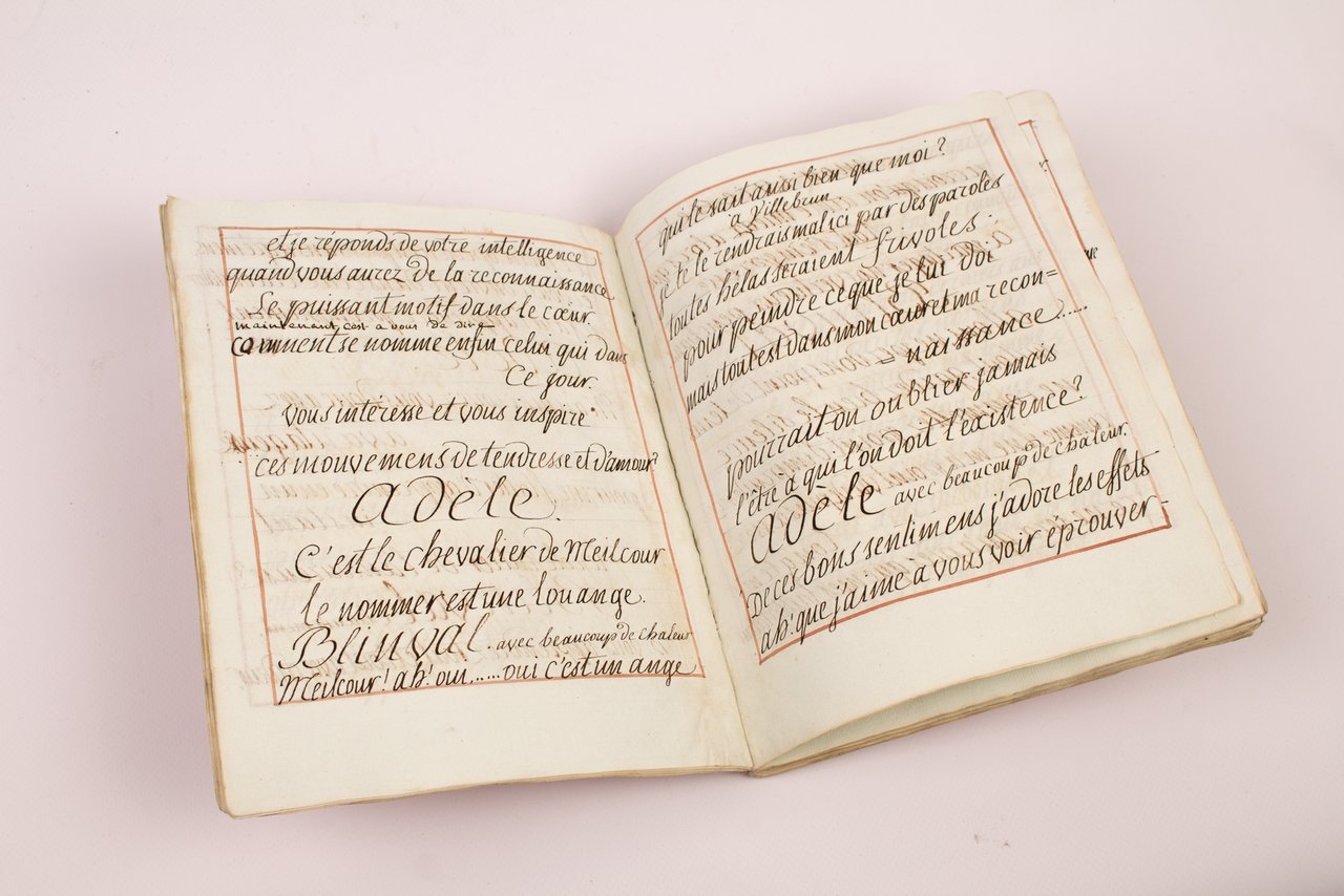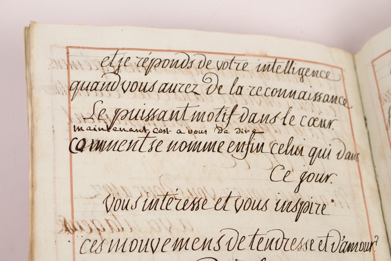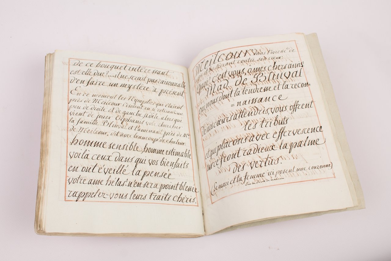- S.n. , s.l. [1810-1812], in-8 (18,5x23,5cm), (1f.) 2 f. découpés (78f.), broché. - La Fête de l'amitié. Unique complete autograph manuscript [The Friendship's Party] [Charenton asylum] n. d. [ca. 1810-1812], in-8: 18,5 x 23,5 cm , (1 f.) 2 f shaved (78 f.), original wrappers The complete original manuscript of the last play by the Marquis de Sade, ruled in red throughout, comprising 78 leaves of 12 lines written recto and verso. This manuscript, like the other extant items from the Marquis, was dictated to a scribe and corrected by Sade himself. Two pages at the beginning of the notebook were excised before the text was written. Contemporary pink paper wrappers, a few lacks to head and foot of spine. Ink title to upper cover "5/ La Fête de l'amitié" including a prologue and a vaudeville sketch entitled Hommage à la reconnaissance, these forming two acts of mixed prose, verse, and vaudeville. This title is incorrect, as shown by the first page, on which the following title appears: "La Fête de l'amitié. Prologue. Encadrant l'Hommage à la reconnaissance. Vaudeville en un acte." Manuscript note by the Marquis to verso of upper cover, indicating the position he intended this work to occupy within his oeuvre. Several manuscript corrections, annotations and deletions in Sade's hand, including a quote from his own work as prelude to the vaudeville: "On est des dieux l'image la belle quand on travaille au bonheur des humains. Hommage à la reconnaissance. [We are in the finest image of the gods when we work for the good of humanity. Homage to recognition.]" "This piece, written by the Marquis in honor of the director of the Charenton Asylum, M. de Coulmiers, was played in the Charenton theatre between 1810 and 1812, approximately a year before the total ban on the plays there was introduced on the 6 May 1813. This late work is the only play of Sade's entire theatrical output at Charenton that has come down to us." The play is historic testimony of Sade's genuine respect - despite the inevitable tensions - for the director of his final home, whom the play lauds under the transparently anagrammatic name of Meilcour. But La Fête de l'amitié is also, by its very subject, a precious source of information on the progress of psychiatric medicine, just freeing itself from its repressive accoutrements in favor of new therapeutic methods, like the drama productions to which Sade contributed heavily and to which he here pays singular homage. The piece is particularly Sadean in its approach of casting madness not in the negative form of an illness, but quite the opposite, through the character of the benevolent God Momus, the focal point in this atypical vaudeville. Essentially, though the feast the play describes is a celebration in honor of the director of an asylum similar to Charenton located in ancient Athens, the central figure is the god of insanity himself, whose presence completely upends the relationship between the sane and the sick - much like with the players in the production itself, in which you couldn't distinguish the professional actors from the inmates of the asylum. The whole production, including both song and dance, is made up of two plays - a prologue/epilogue, La Fête de l'amitié, followed by a vaudeville: Hommage à la reconnaissance, played by the same characters as the prologue. The complete production was played at the "festival for the Director." Each dramatic layer is an allegorical variant on the real situation and there's no doubt that the actors, as they got deeper and deeper into the piece, were still playing their own parts. The work of a polished writer in full control of his subject and all the various dramatic and narrative tools, this seemingly frothy piece - by virtue of belonging to the literary genre of homage, which is very conventional and strictly codified - nonetheless contains the subversive elements so dear to the Marquis. And it's also a man who has suffered the regular confiscation and destructio