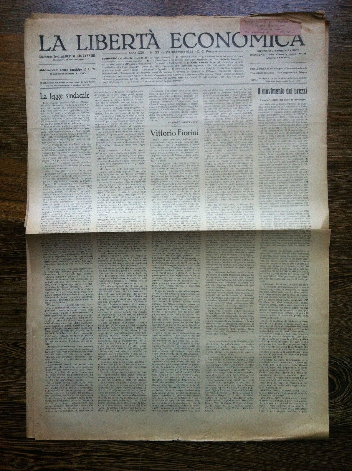 LA LIBERTA' ECONOMICADirettore Prof. Alberto GiovanniniCopia indirizzata in abbonamento al Sig. Prof. Luigi Einaudi Torino Senatore del RegnoIn buono stato (25 g)E11364