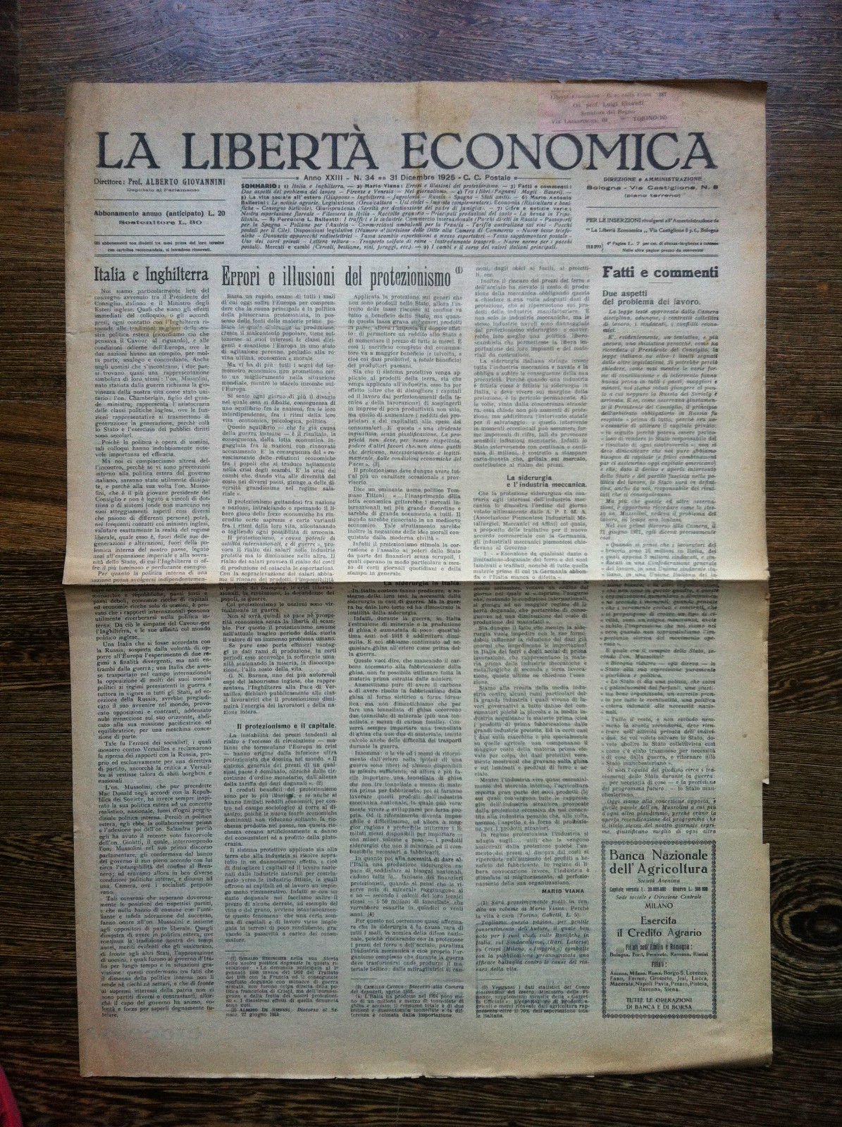 La libertà economica 31 Dicembre 1925 Anno XXIII n^ 34 - E11365 | Rare and modern books | ,